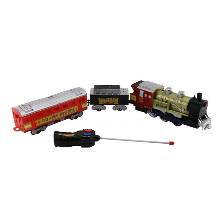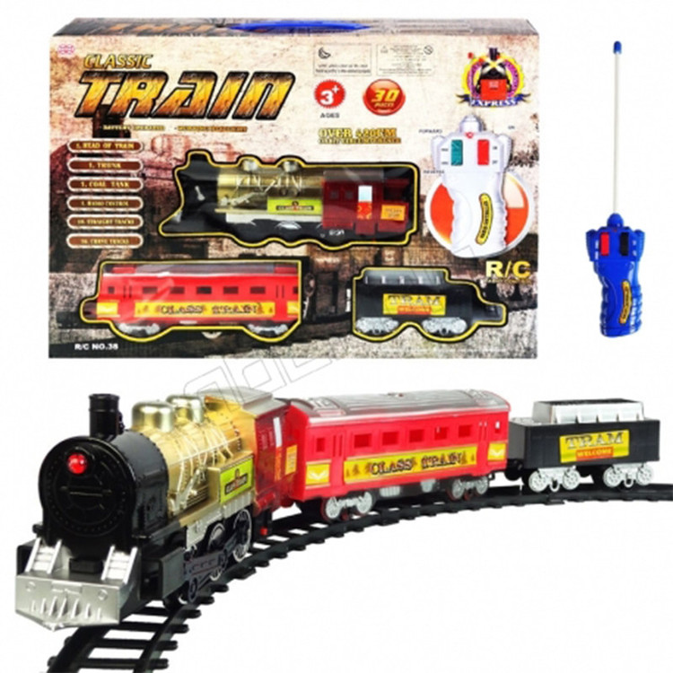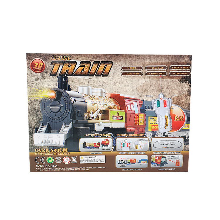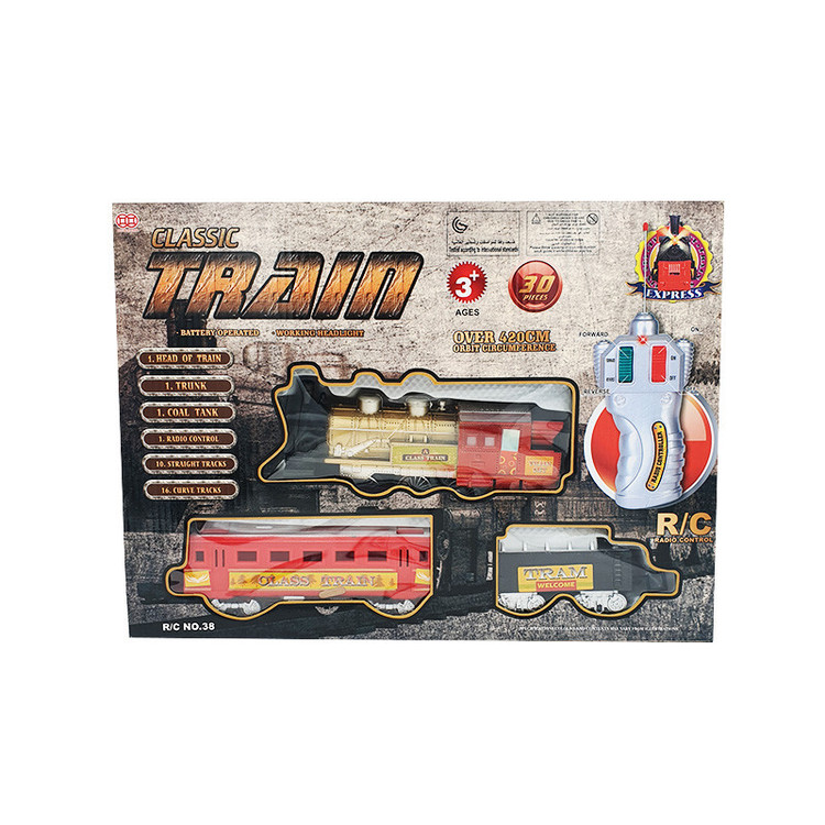 اقلام همراه: - یک عدد لوکوموتیو - یک عدد واگن - یک عدد مخزن ذغال سنگ - یک عدد ریموت R/C - 26 قطعه ریل سازی