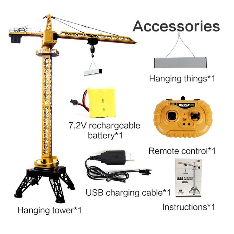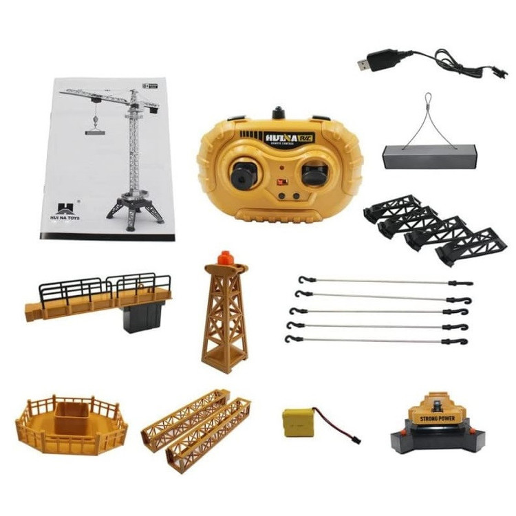 باتری قابل شارژ 7.2 ولت برای جرثقیل در بسته بندی موجود است . نیاز به دو عدد باتری قلمی برای کنترل میباشد که در بسته بندی موجود نیست .