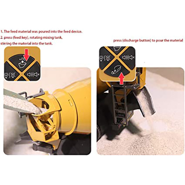 ماشین میکسر بتن کنترلی HUINa 1574 Remoted (ماشین میکسر بتن الکتریکی) دارای چراغ های که در هنگام حرکت ماشین بتن کمپرسی به جلو و عقب چراغ های جلو و عقب روشن می شود . این ماشین بتن جذاب با ریموت کنترلی حرفه ای تا 50 متر را ساپورت می کند . از نکات جالب این ماشین الکتریکی حرکت میکسر آن در جهت و خلاف جهت حرکت ساعت می باشد و سرعت 20 کیلومتر در ساعت دارد.ابعاد این ماشین الکتریکی به نحوی طراحی و ساخته شده که بتواند هنگام حرکت بر روی مسیرهای دشوار بسیار حرفه ای عمل کند و موانع را به خوبی رد کند .ماشین میکسر بتن الکتریکی HUINa 1574 Remoted باتوجه به نمونه واقعی آن و در مقیاس 1:14 طراحی و ساخته شده و بسیار شبیه به نمونه واقعی آن می باشد .ماشین میکسر بتن کنترلی Remoted از بدنه بسیار محکم و در عین حال قابل انعطاف می باشد . متریال به کار برده شده در این ماشین کنترلی شارژی پلاستیک مستحکم و فشرده و ABS می باشد .کمک فنر های این ماشین از جنس کمک فنر فلزی بوده و طوری طراحی شده باعث می شود که این ماشین الکتریکی را در برابر ضربات حفظ کند و امنیت این ماشین الکتریکی را چند برابر کند . نکته خیلی جالب در این میکسر این است که می توانید داخل میکسر موادی بریزید(مانند برنج) و میکسر مانند نمونه واقعی شروع به کار کردن می کند.همچنین داشتن چراغ در جلو و عقب ماشین بتن باعث می شود که از این اسباب بازی در هنگام شب و در تاریکی استفاده نمود. ماشین میکسر بتن کنترلی HUINa 1574 Remoted دارای باتری 7.2 ولت می باشد که با زمان شارژ 3 الی 4 ساعت می تواند مدت زمان 20 الی 30 دقیقه به شما بازی مفید دهد . در نظر داشته باشد برای بالا رفتن عمر باتری ماشین های خود کافیست ابتدا قبل از بازی کردن با ماشین شارژی آن را به مدت 4 الی 5 ساعت داخل شارژ قرار دهید تا بتوانید مدت زمان طولانی تری از باتری خود استفاده کنید . لازم به ذکر است بدانید برای عمر بیشتر باتری های خود حتما پس از بازی و خالی شدن باتری ماشین آن را کاملا شارژ کره و برای استفاده بعدی کنار بگذارید از دیگر نکات این ماشین الکتریکی شارژر آن می باشد که از نوع USB می باشد و برای بعد از 8 سالگی مناسب می باشد.