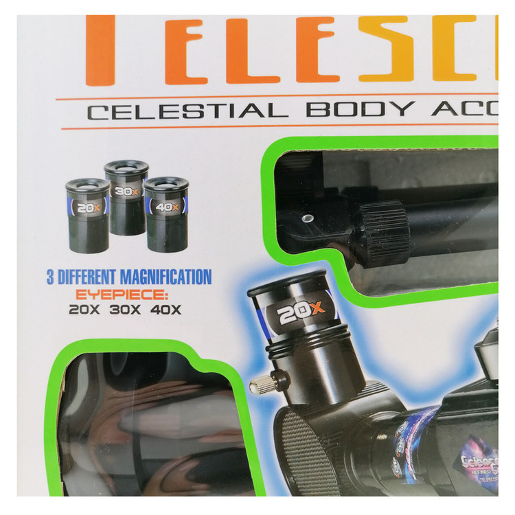 یک تلسکوپ کوچک همیشه یکی از اصلیترین تجهیزات هر ماجراجو، دریانورد و یا ستارهشناس کوچکی بوده و هست. این تلسکوپ با 3 عدسی با بزرگنمایی های 20، 30 و 40 برابر مجهز شده است که میتواند اشیاء را 20، 30 و 40 برابر اندازه واقعی اشان نشان دهد. شما میتوانید بهراحتی درب عدسی این تلسکوپ و درب چشمی آن را برداشته، به دوردستها خیره شوید و جزئیات سری و شگفتانگیز این دنیا را بهتنهایی کشف کنید. در صورت تمایل برای فوکوس کردن، میتوانید طول آن را 17 سانتی متر افزایش دهید، تلسکوپ چرخش 360 درجه روی پایه خود دارد و با چرخاندن پیچ بدنه در محور Xها زاویه تنظیم میشود. مجهز به قطب نمای دقیق برای رصد هرچه دقیق تر اجسام آسمانی شده است. به یاد داشته باشید که با تلسکوپ به خورشید نگاه نکنید.