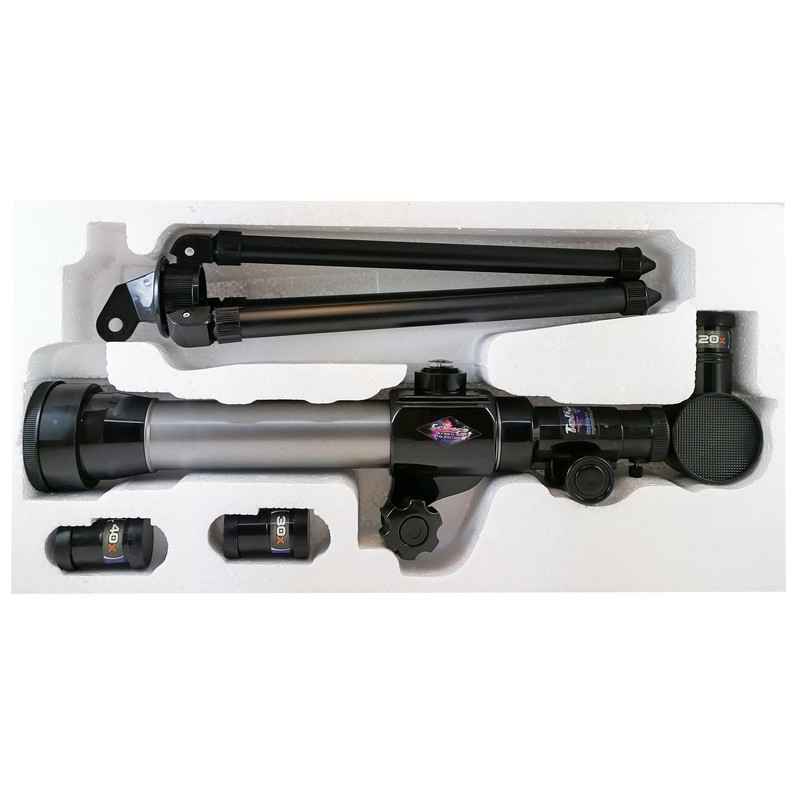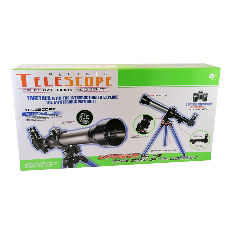 یک تلسکوپ کوچک همیشه یکی از اصلیترین تجهیزات هر ماجراجو، دریانورد و یا ستارهشناس کوچکی بوده و هست. این تلسکوپ با 3 عدسی با بزرگنمایی های 20، 30 و 40 برابر مجهز شده است که میتواند اشیاء را 20، 30 و 40 برابر اندازه واقعی اشان نشان دهد. شما میتوانید بهراحتی درب عدسی این تلسکوپ و درب چشمی آن را برداشته، به دوردستها خیره شوید و جزئیات سری و شگفتانگیز این دنیا را بهتنهایی کشف کنید. در صورت تمایل برای فوکوس کردن، میتوانید طول آن را 17 سانتی متر افزایش دهید، تلسکوپ چرخش 360 درجه روی پایه خود دارد و با چرخاندن پیچ بدنه در محور Xها زاویه تنظیم میشود. مجهز به قطب نمای دقیق برای رصد هرچه دقیق تر اجسام آسمانی شده است. به یاد داشته باشید که با تلسکوپ به خورشید نگاه نکنید.