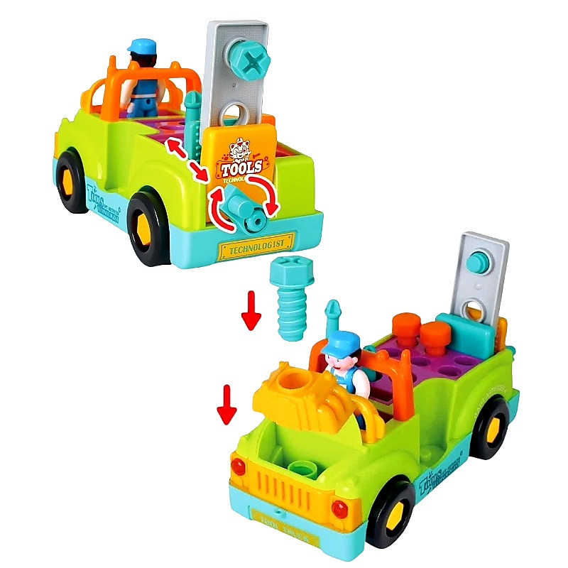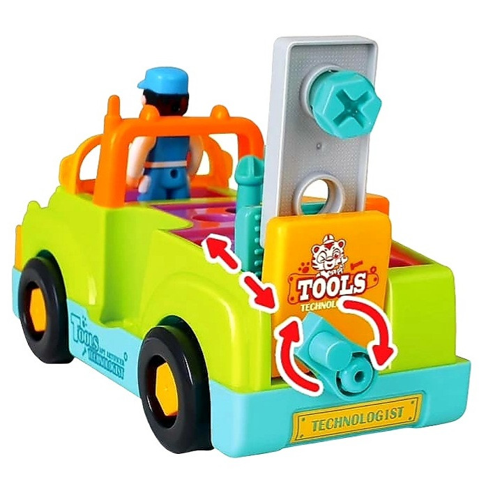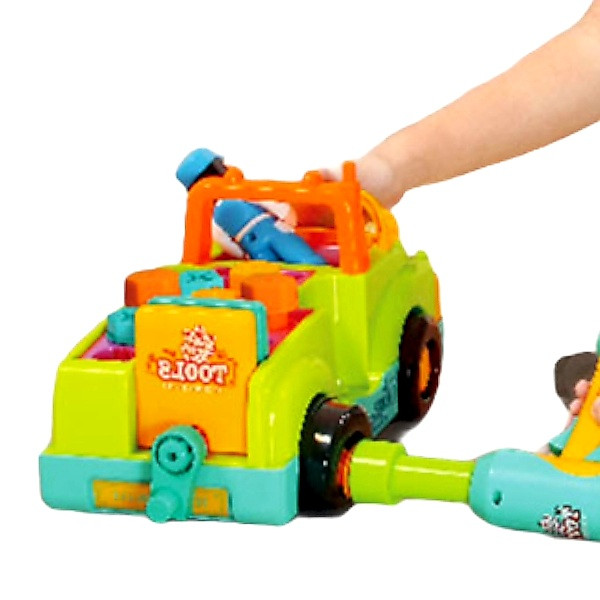 در ماشين جعبه ابزار هولي تويز، یک پیچ گوشتی برقی وجود دارد که به وسیله آن میتوان پیچها را سفت کرد و داری دو سری مختلف برای پیچهای مختلف است. در پشت ماشین مکانی برای قرار دادن ابزارهای همراه ماشین وجود دارد. شیارهایی برای قرار دادن پیچها نیز وجود دارد. این اسباب بازی موزیکال است و در حین حرکت آهنگ پخش کرده و از طرفی نیز چراغهای جلوی آن نیز روشن میشوند.