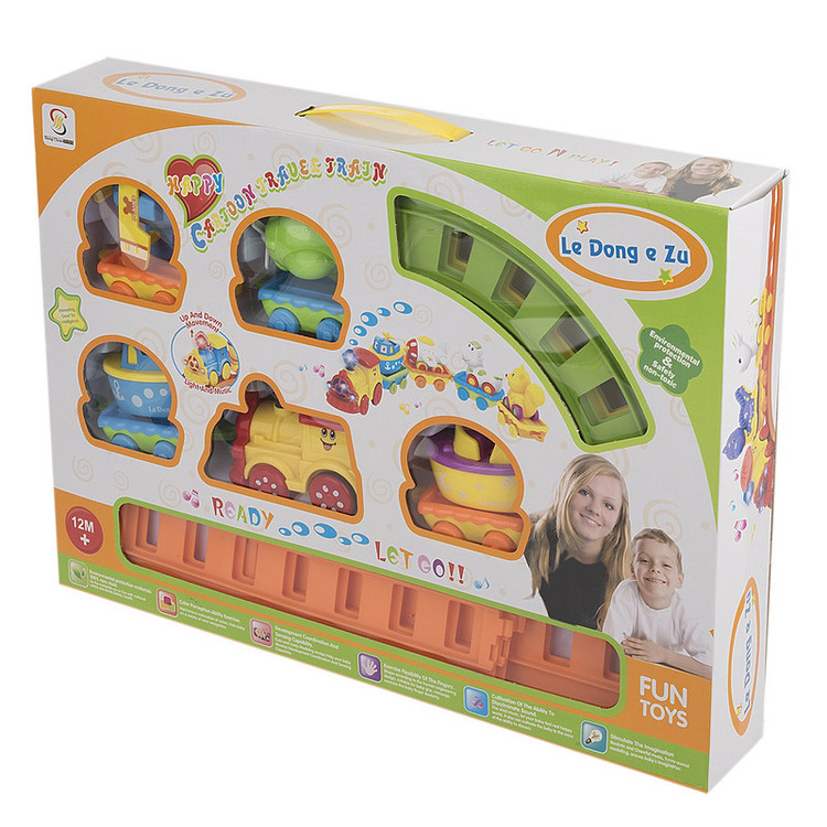 این قطار اسباببازی رنگی دارای ریلهای متنوع، منحنی و مستقیم است که بهصورت کشویی و بهراحتی به یکدیگر متصل میشوند. و میتوان آنها را به مدلهای مختلف قرارداد. مثلاً اگر 4 ریل پلاستیکی را به یکدیگر متصل کنید یک مسیر دایرهای شکل به قطر 41 سانتیمتر خواهید داشت. همینطور اگر 4 ریل مستقیم و 4 ریل منحنی را استفاده کنیم یک مسیر مربعی شکل به قطر 43 سانتیمتر داریم. اگر مسیر طولانیتری را میخواهید امتحان کنید میتوانید 4 ریل پلاستیکی سبزرنگ و 4 ریل نارنجیرنگ را به یکدیگر به شکل مستطیل وصل کرده و یک مسیر طولانی 94.5 سانتیمتری را بسازید. میتوان با استفاده از 4 ریل پلاستیکی نارنجیرنگ و 2 ریل سبزرنگ یک مسیر بیضی به طول 62 سانتیمتر ساخت. کودک در حین بازی با این اسباببازی رنگین، علاوه بر شناخت رنگهای مختلف، با شکلهای هندسی دایره، مربع و مستطیل و بیضی نیز آشنا شده و بهتدریج ماهیچههای دستش نیز قویترمی شود. از طرفی دیگر در حین بازی با وسایل حملونقل گوناگون هم آشنا میشود. واگنهای این قطار وسایل مختلفی همچون قایق، هواپیمای مسافربری و تکسرنشین و یک کشتی مسافربری است که بهراحتی به یکدیگر متصل میشوند.